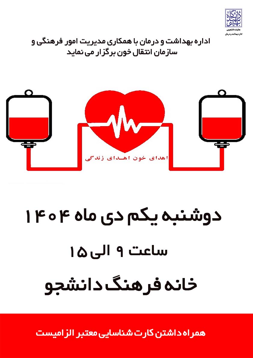 پیرو درخواست های مکرر دانشجویان و دانشگاهیان گرامی، باهماهنگی های انجام شده تیم سیار سازمان انتقال خون در روز دوشنبه یکم دی ماه 1404 از ساعت 9 الی15 در خانه فرهنگ دانشجو مستقر می باشند.