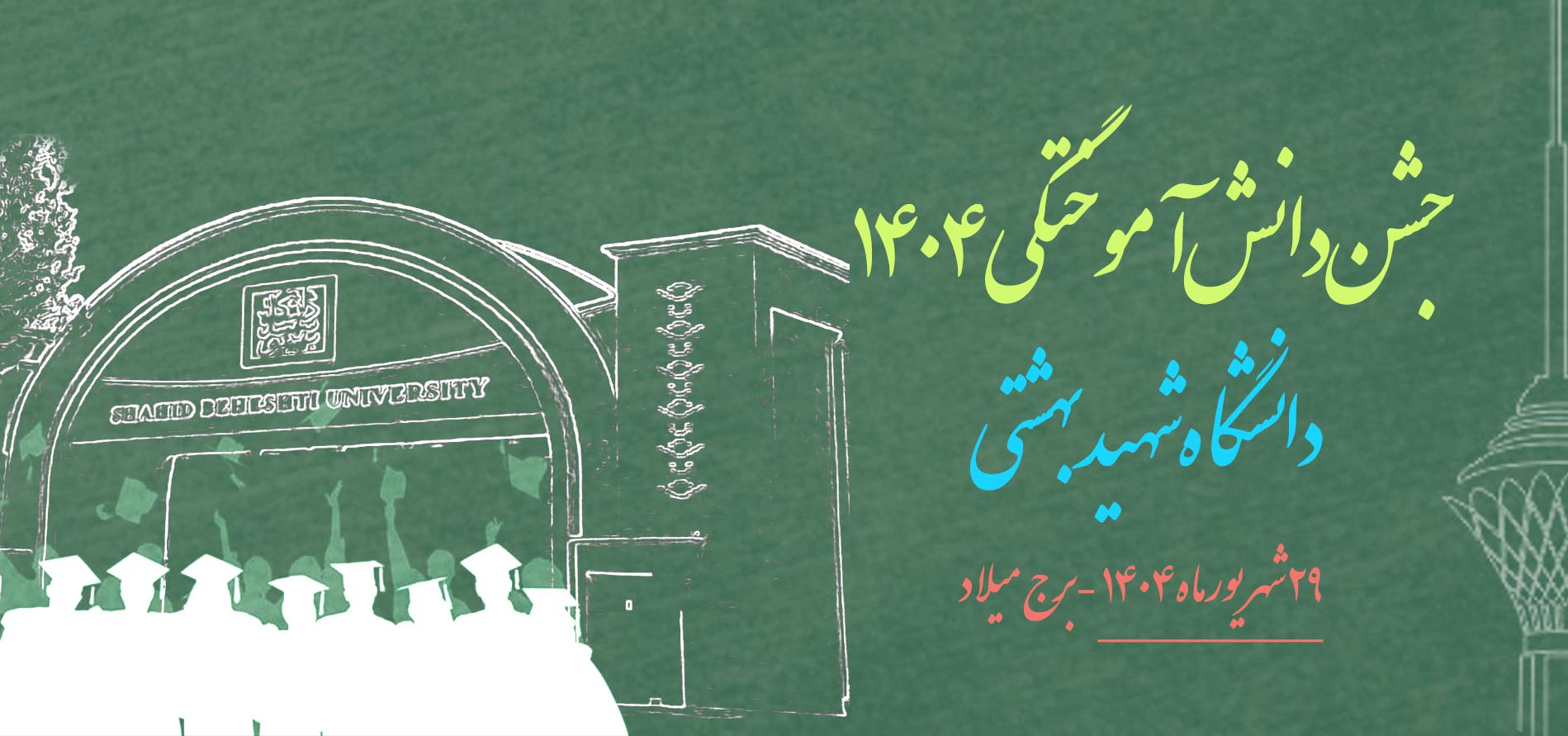 به اطلاع می رساند جشن دانشآموختگی سال تحصیلی 1404 ویژه دانش آموختگان ورودی های کارشناسی و دکتری 1400 و کارشناسی ارشد 1402 در تاریخ 29 شهریورماه در محل برج میلاد تهران توسط معاونت فرهنگی و اجتماعی برگزار می شود.