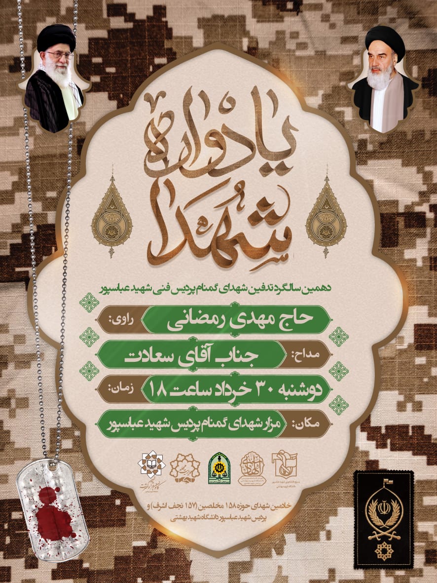 مراسم دهمین سالگرد تدفین شهدای گمنام پردیس فنی شهید عباسپور دوشنبه 30 خردادماه ساعت 18 به شرح زیر خواهد بود.