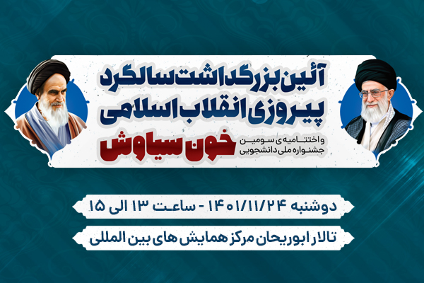 آئین بزرگداشت سالگرد پیروزی انقلاب اسلامی و اختتامیه سومین جشنواره ملی دانشجویی خون سیاوش در تاریخ 24 بهمن ماه از ساعت 13 الی 15 در تالار ابوریحان مرکز همایش های بین المللی دانشگاه برگزار می شود.