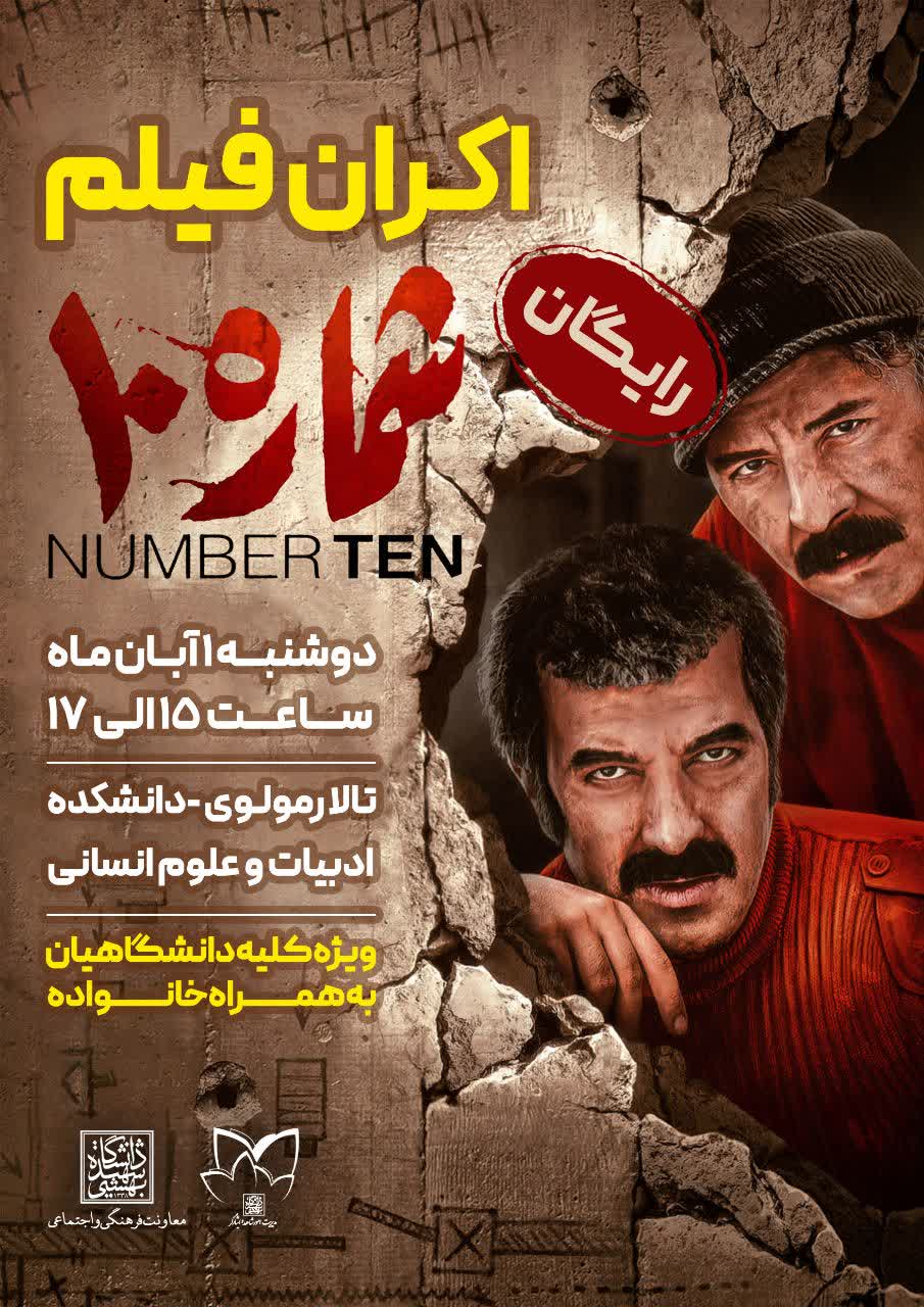 به همت اداره شاهد و ایثارگر، فیلم سینمایی شماره 10 به کارگردانی حمید زگری نژاد در روز دوشنبه اول آبان ماه 1402 ساعت 15 در تالار مولوی دانشکده ادبیات و علوم انسانی اکران خواهد شد.