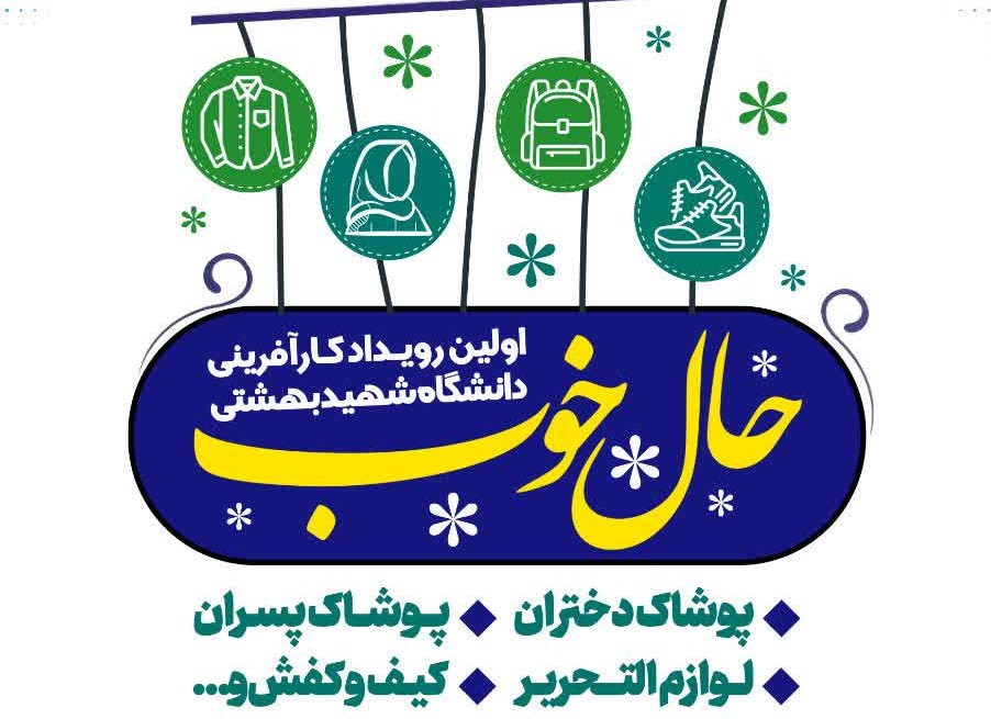 به مناسبت روز دانشجو اولین رویداد کارآفرینی حال خوب دانشگاه شهید بهشتی ویژه دانشجویان، اساتید و کارکنان با برپایی ۲۰ غرفه و حضور ۱۰ بانوی موفق کارآفرین در موضوعات پوشاک دختران و پسران، کیف و کفش، لوازم التحریر برگزار می گردد.