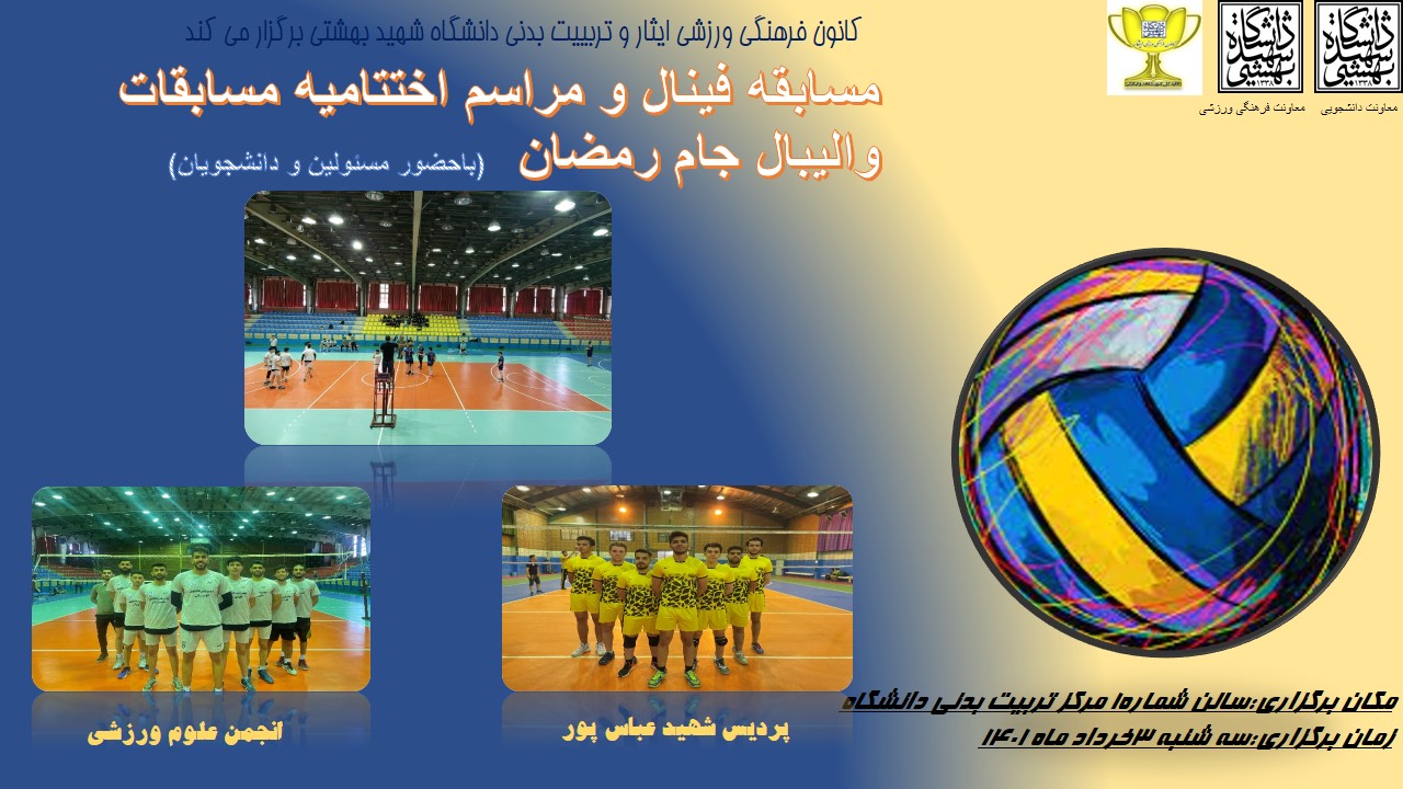مسابقات والیبال جام رمضان به همت کانون فرهنگی ورزشی ایثار و تربیت بدنی بسیج کارکنان دانشگاه با حضور 8 تیم از تاریخ هفتم اردیبهشت ماه آغاز گردید.