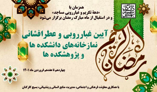 با عنایت به شروع آموزش حضوری در دانشگاه و همزمان با دهۀ تکریم و غبارروبی مساجد و در استقبال از ماه مبارک رمضان، غبارروبی و عطرافشانی نمازخانههای دانشکدهها و پژوهشکدههای دانشگاه از تاریخ چهاردهم تا هفدهم فروردین انجام خواهد شد.