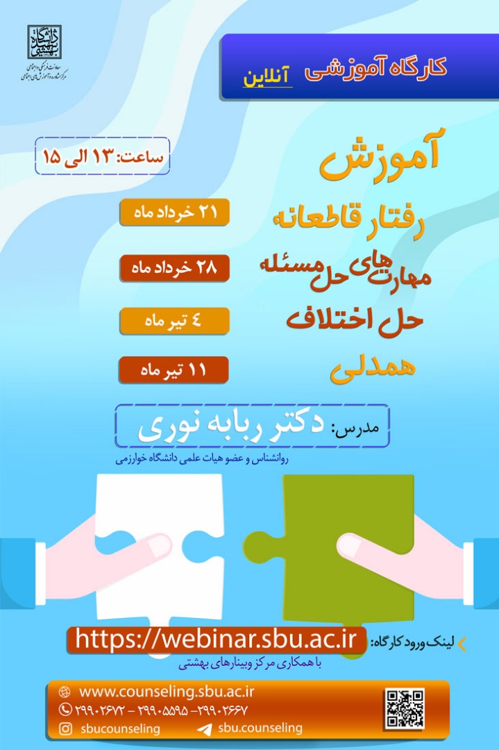 مركز مشاوره و آموزشهای اجتماعی برگزار ميكند كارگاه آموزشی آنلاين «رفتار قاطعانه» امروز شنبه 21 خرداد ١٤00 دانشجويان و دانشگاهيان گرامی، جهت شركت در كارگاه آموزشی مذكور، میتوانيد از طريق لينک زير اقدام فرماييد. https://webinaronline.ir/Link/S2237671135