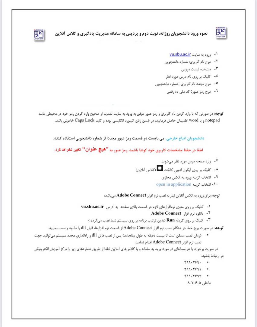 به اطلاع اساتید و دانشجویان محترم می رساند راهنمای ورود به سامانه مدیریت یادگیری و کلاس آنلاین در لینک های ذیل قرار داده شده است: