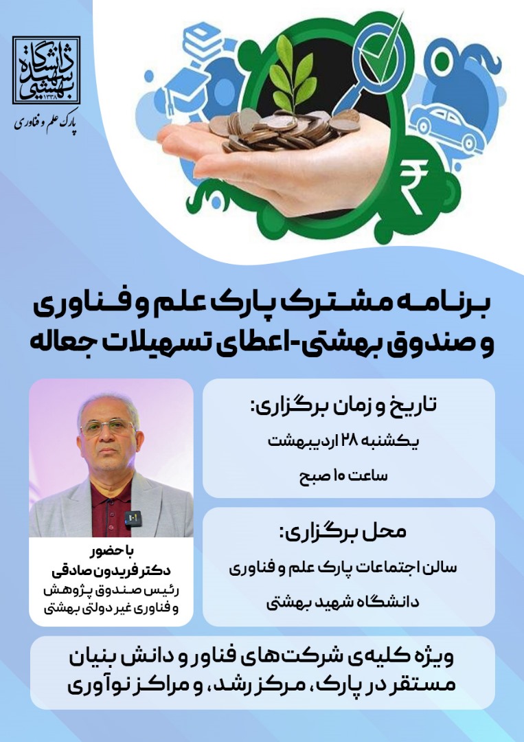 پارک علم و فناوری دانشگاه شهید بهشتی با همکاری صندوق پژوهش و فناوری غیردولتی بهشتی، برنامه‌ای ویژه برای اعطای تسهیلات جعاله برگزار می‌ کند.