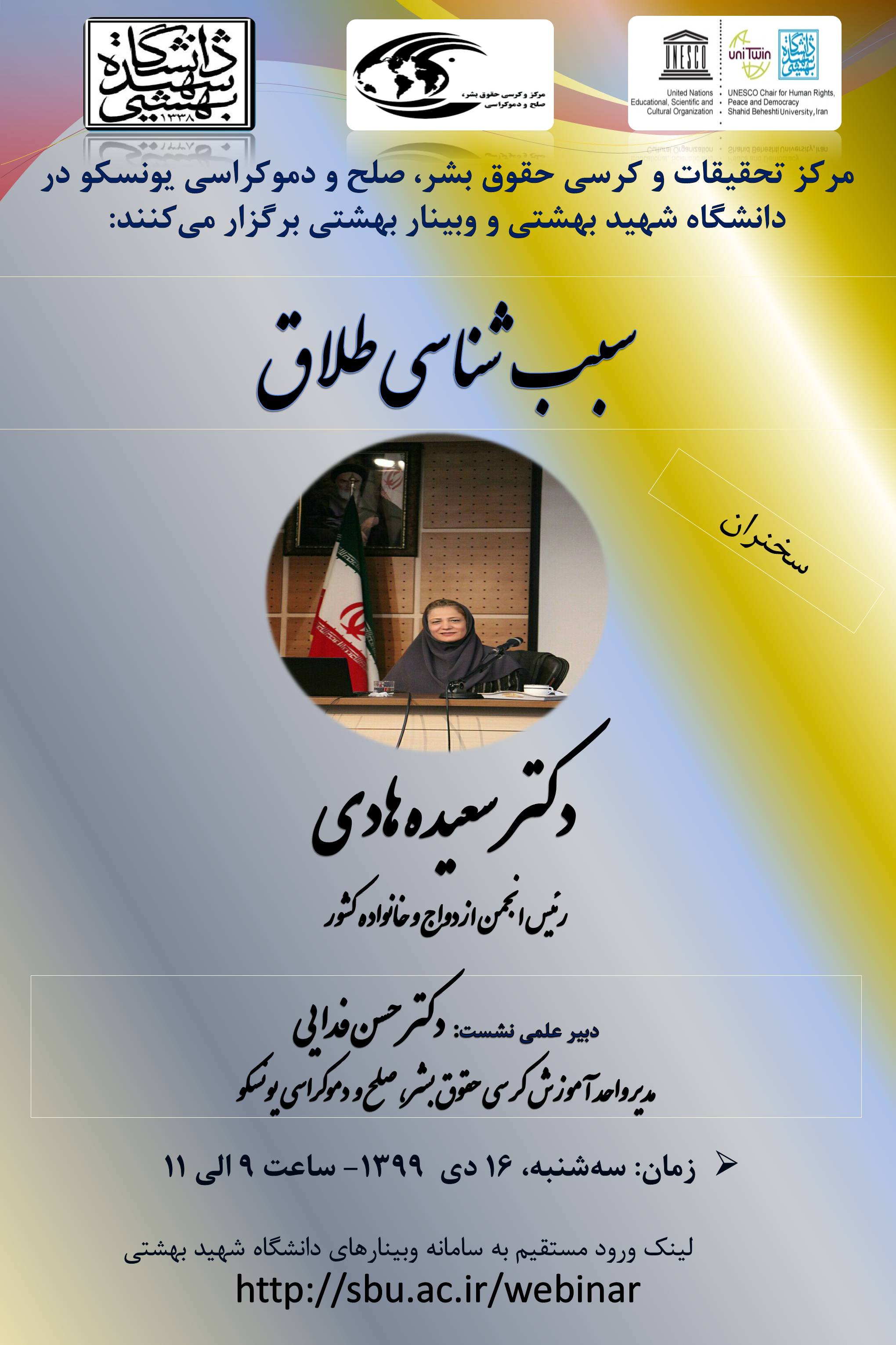 برگزاری وبینار سبب شناسی طلاق 9665 بازدید print share 16 دی به اطلاع دانشجویان، پژوهشگران و علاقمندان محترم می رساند مرکز تحقیقات و کرسی حقوق بشر، صلح و دموکراسی یونسکو در دانشگاه شهید بهشتی با...